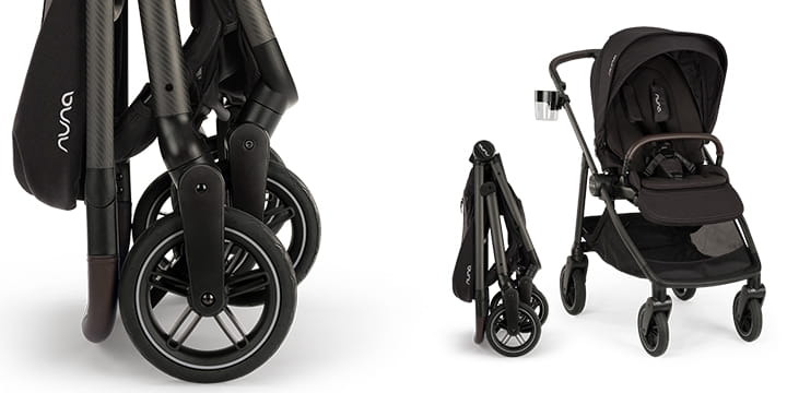 Wózek Nuna SWIV można łatwo złożyć jedną ręką, a po złożeniu stoi samodzielnie, co ułatwia przechowywanie. Posiada duży kosz na zakupy o pojemności do 10 kg, idealny do codziennych sprawunków.