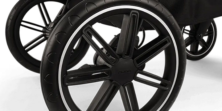 Dzięki dużym kołom z pianki EVA, pełnej amortyzacji i technologii sprężynowania pod siedziskiem, wózek świetnie radzi sobie na miejskich chodnikach, leśnych ścieżkach czy brukowanych alejkach. Przednie koła z blokadą skrętu pomagają w prowadzeniu na trudniejszym terenie.