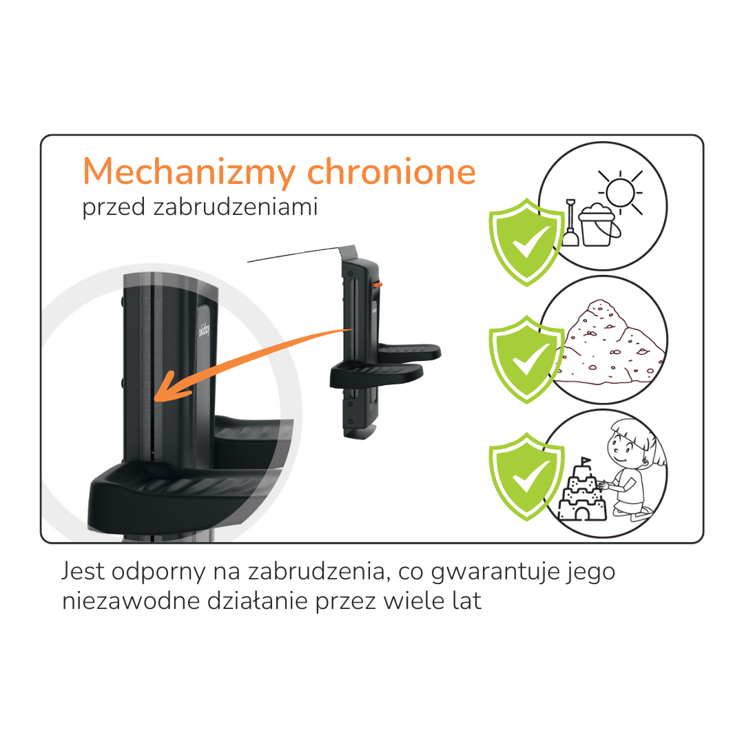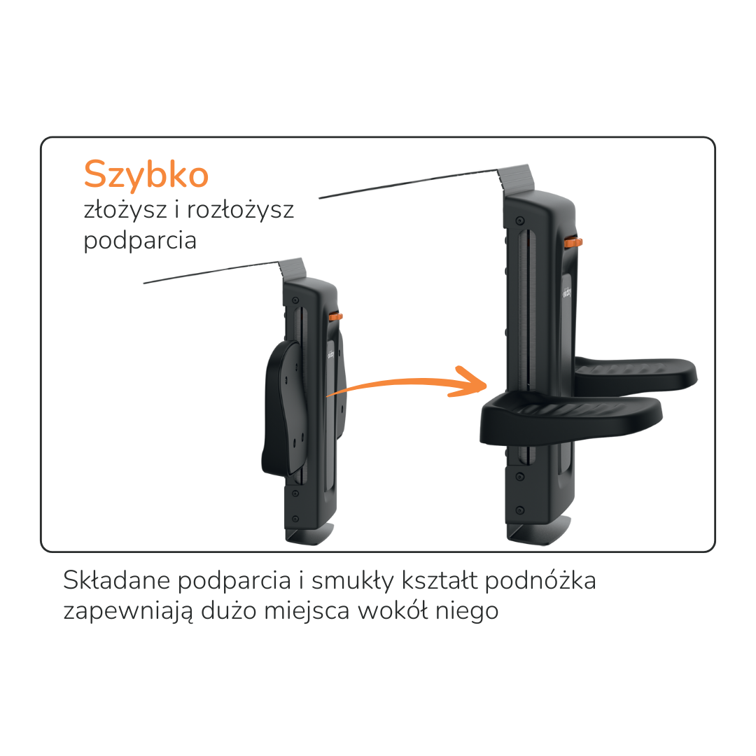 Podesty w podnóżku są regulowane na wysokość, w zakresie 20 cm. Mechanizm, który odpowiada za ich regulację jest bardzo prosty w użyciu. Pokrętło do regulacji jest przystosowane do mniejszych dłoni co oznacza, że pasażer samodzielnie poradzi sobie z dostosowaniem wysokości podestu do swojego wzrostu.