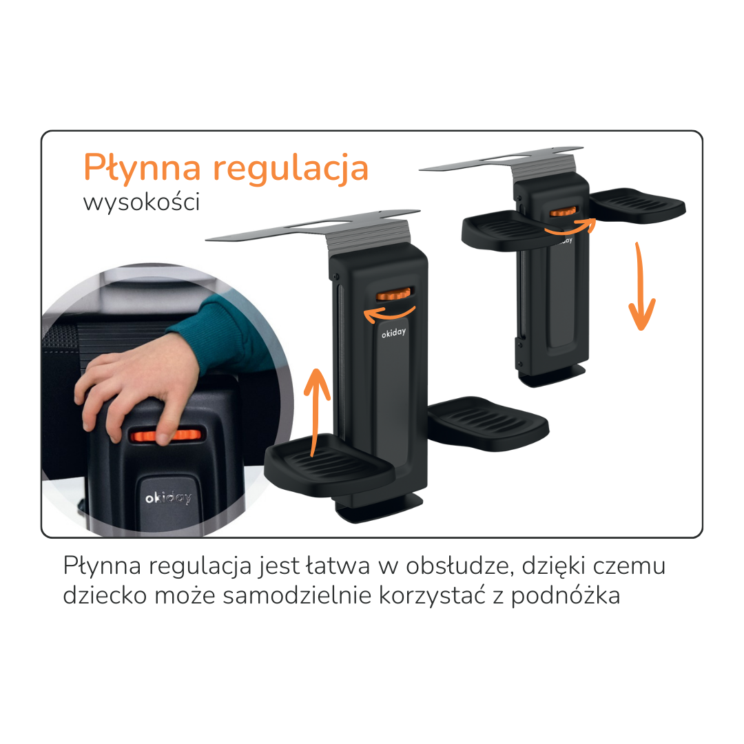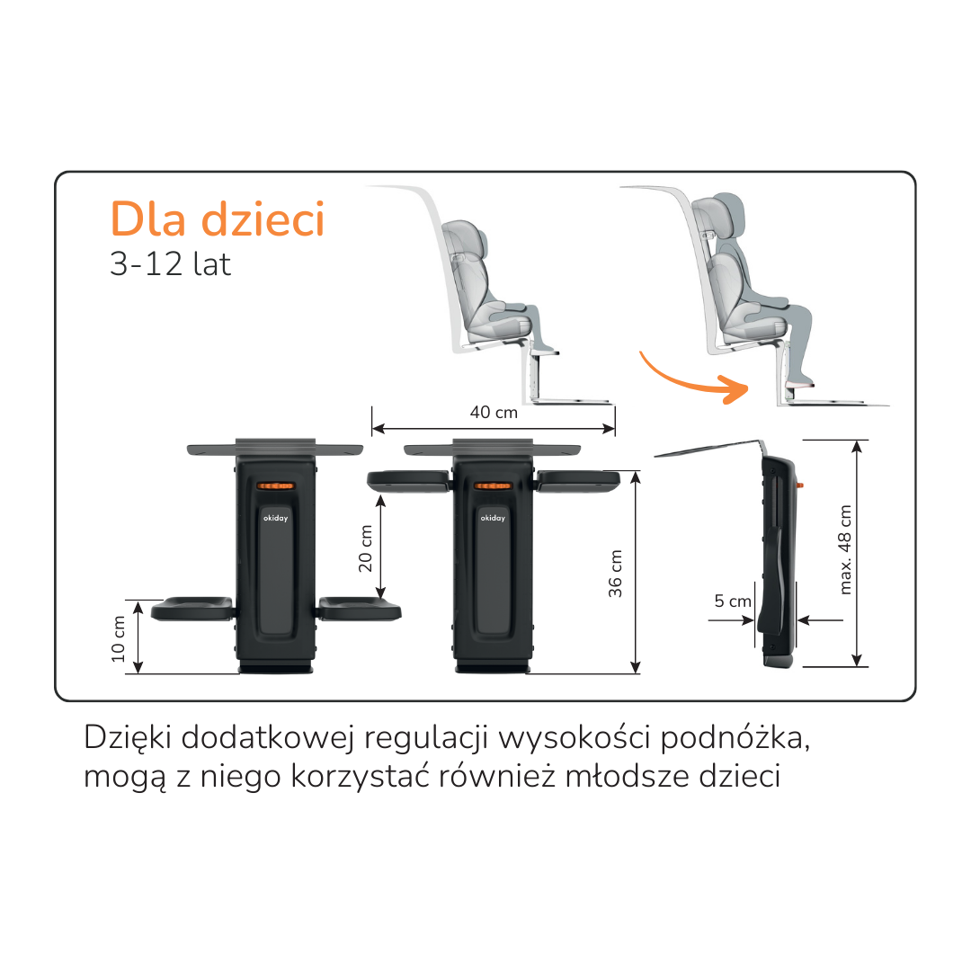 Podnóżek Okiday stworzono z myślą o dzieciach w wieku od 5 do 12 lat, posiada mechanizm umożliwiający regulację wysokości podestów na stopy. Łatwy montaż w samochodzie i kompatybilność z każdym samochodem z systemem Isofix świadczy o uniwersalności tego praktycznego akcesorium.