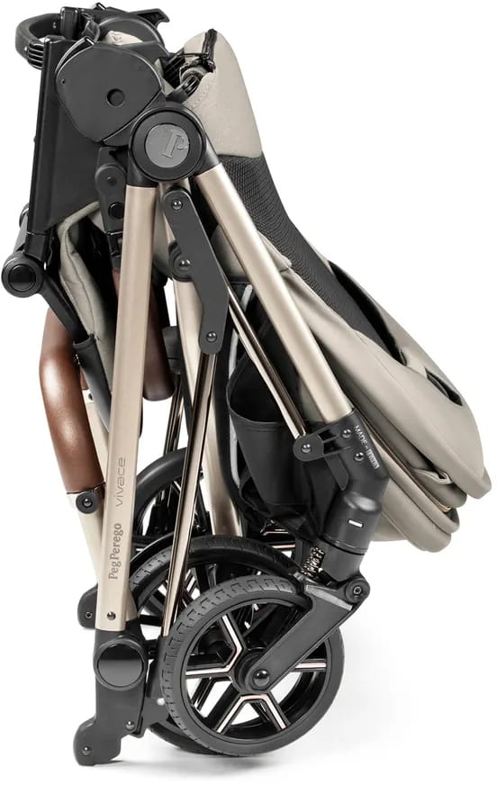 Wózek składa się do niewielkich rozmiarów, za pomocą jednego przycisku. Automatyczny system składania wózka PegPerego Vivace nie jest uzależniony od kierunku, w którym zamontowano siedzisko. Co więcej, podczas składania chowa się ono do wewnątrz, dzięki czemu jego tapicerka jest chroniona przed zabrudzeniami.