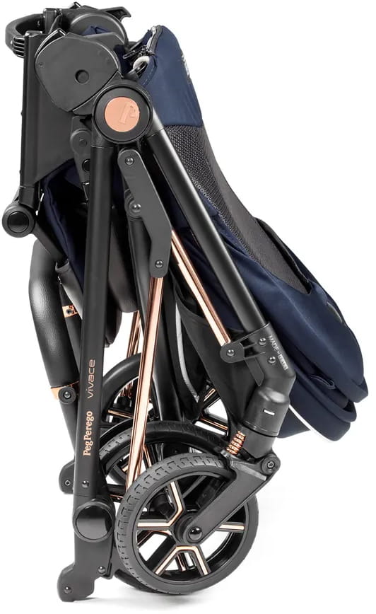 Wózek składa się do niewielkich rozmiarów, za pomocą jednego przycisku. Automatyczny system składania wózka PegPerego Vivace nie jest uzależniony od kierunku, w którym zamontowano siedzisko. Co więcej, podczas składania chowa się ono do wewnątrz, dzięki czemu jego tapicerka jest chroniona przed zabrudzeniami.