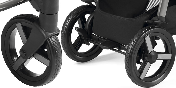 Zwrotność wózka oraz łatwość manewrowania w różnym terenie to zasługa kół - są bardzo wytrzymałe, a przede wszystkim bezobsługowe. Oznacza to, że możesz swobodnie poruszać się po mieście i w lesie bez ryzyka spotkania niemiłej niespodzianki. Przednie koła są obrotowe, posiadają wygodną i łatwą w obsłudzę blokadę do jazdy na wprost. Wyruszaj w długie przechadzki i odkrywaj świat - Peg Perego Ypsi pomoże Ci zrealizować każdy plan na podróże.