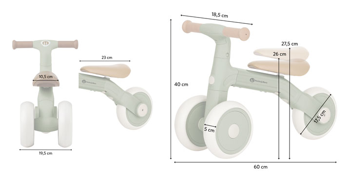 Kompaktowe wymiary (długość 60 cm, wysokość 40 cm) sprawiają, że rowerek jest niezwykle łatwy w transporcie i przechowywaniu, nawet w mniejszych mieszkaniach. Stabilny rozstaw kół (do 35 cm z pedałami) zapewnia bezpieczeństwo przy maksymalnym obciążeniu do 25 kg, czyniąc Bingo trafnym wyborem na lata.