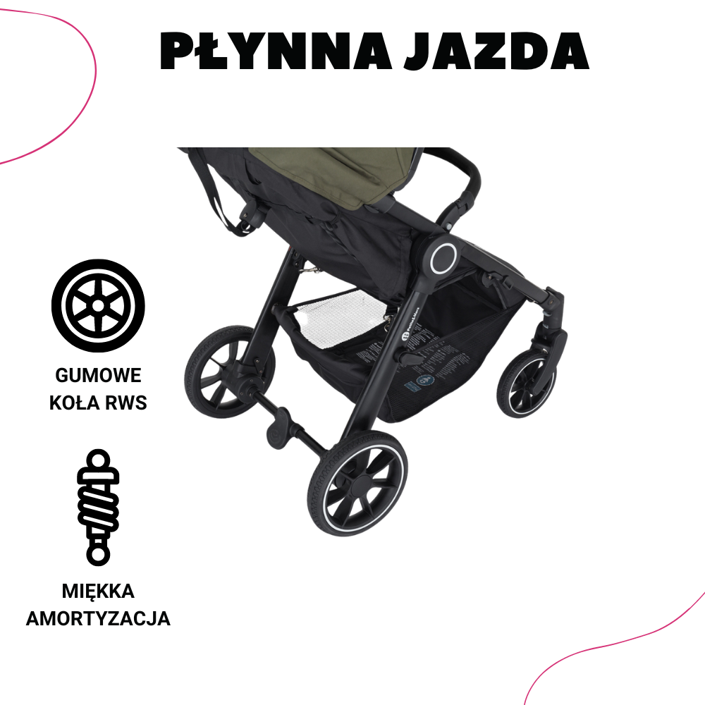 Wózek jest stworzony do długiej, wieloletniej jazdy - stworzono go z myślą nie tylko o mieście, ale też parku czy leśnych terenach. W pełni pompowane koła AIR oraz miękka amortyzacja umożliwiają bezproblemową, płynną jazdę w różnych warunkach.