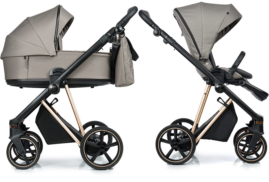 • możliwość złożenia wózka z siedziskiem spacerowym wpiętym przodem i tyłem do rodzica.