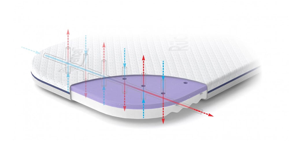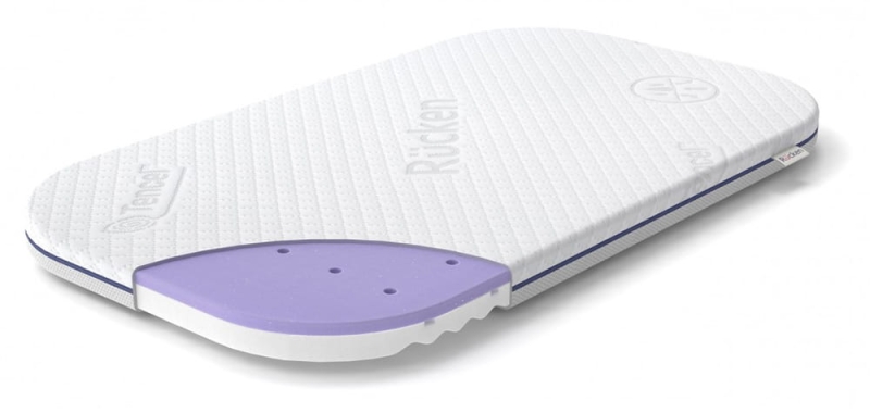 Wysokiej jakości materac Rucken do łóżeczka dostawnego Kinderkraft Neste Up i Neste Air składa się z certyfikowanych materiałów z Oeko-Tex 100, a fioletowa pianka VitaRest po jednej stronie materaca posiada odznakę. Pokrowiec można prać w 60 stopniach.