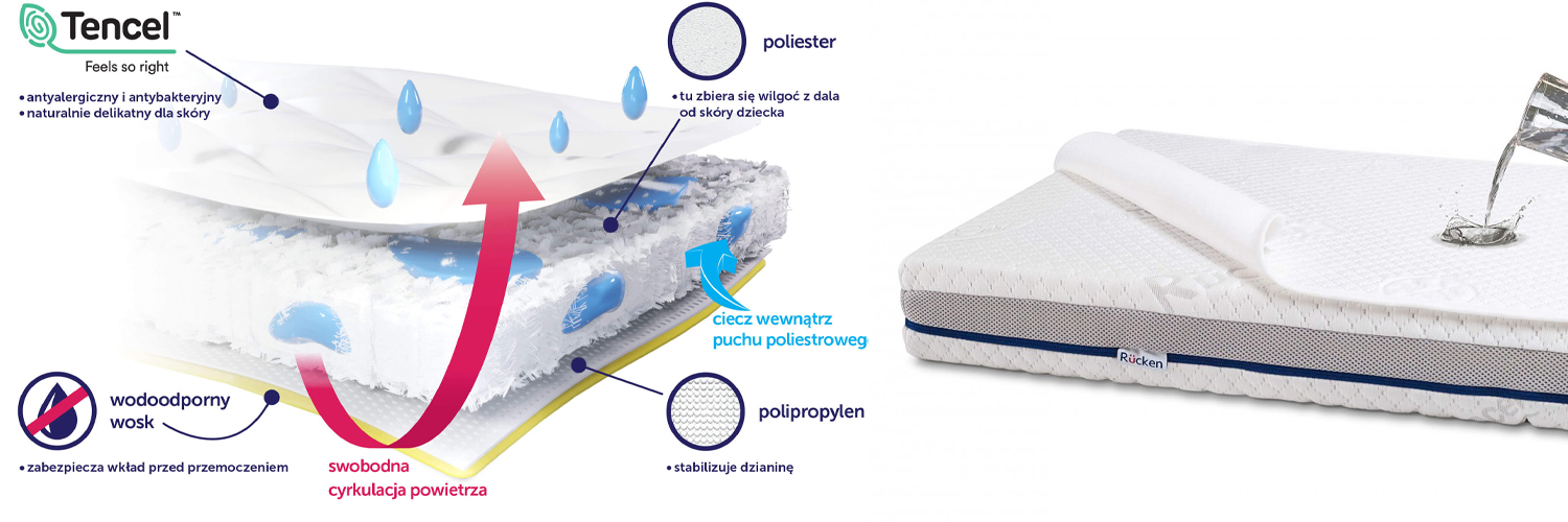 Na kolejną warstwę ochraniacza składa się poliestrowy puch, który od spodu został dodatkowo wzmocniony warstwą polipropylenową oraz pokryty wodoodpornym woskiem. Tak zabezpieczony ochraniacz dba o to, aby nawet podczas małej awarii ciecz nie przedostała się do wnętrza materaca.