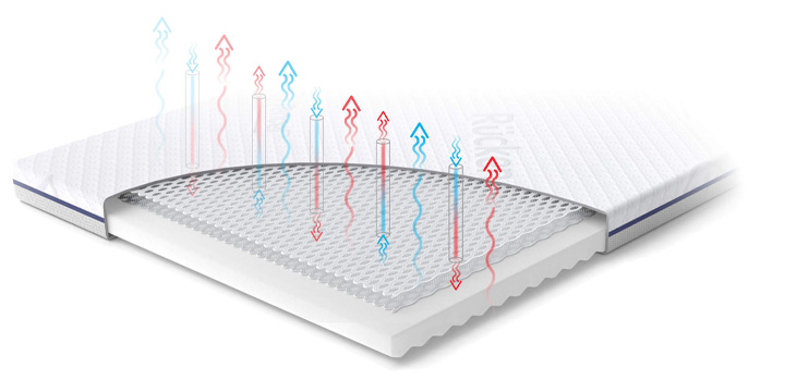 Materac Rucken Travel Aero jest doskonale wentylowany, zarówno od wewnątrz, jak i zewnątrz - jego wnętrze składa się z profilowanej pianki po jednej stronie i oddychającej maty 3D po drugiej. Z zewnątrz materac posiada pokrowiec HYDROMAX stworzony z tkaniny Tencel oraz oddychającej siatki 3D. To właśnie sprawia, że materac dba o zachowanie optymalnej twardości i higieny podczas codziennego użytkowania.