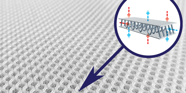 Druga strona pokrowca to siatka 3D, którą zintegrowano z profilem fali w piance materaca. Takie połączenie wzmacnia wentylację w materacu Rucken Travel Aero.