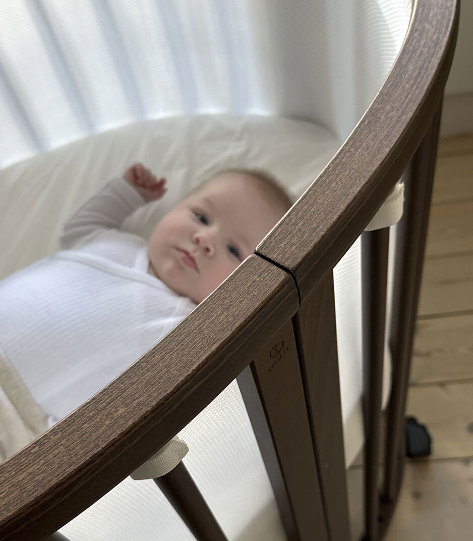 Rama łóżeczka jest osadzona na obrotowych kołach, które po odblokowaniu umożliwią Ci poruszanie się z łóżeczkiem po całym mieszkaniu. Jeśli po przebudzeniu maluszek ma problem z zaśnięciem, możesz go delikatnie pobujać. Szerokość Stokke Sleepi Mini V3 wynosi jedyne 67 cm, dlatego bez problemu przejedzie przez próg drzwi w większości mieszkań.