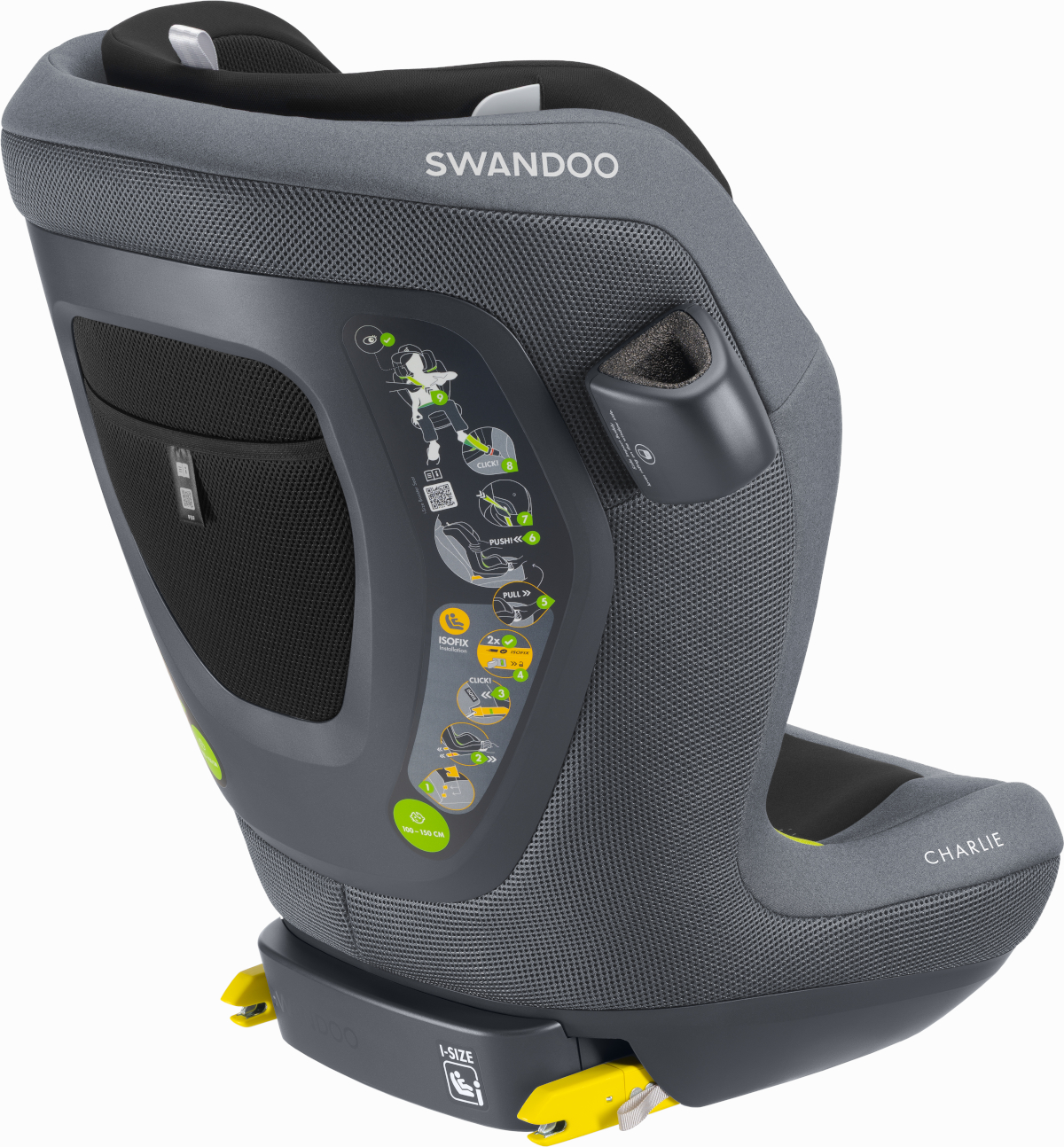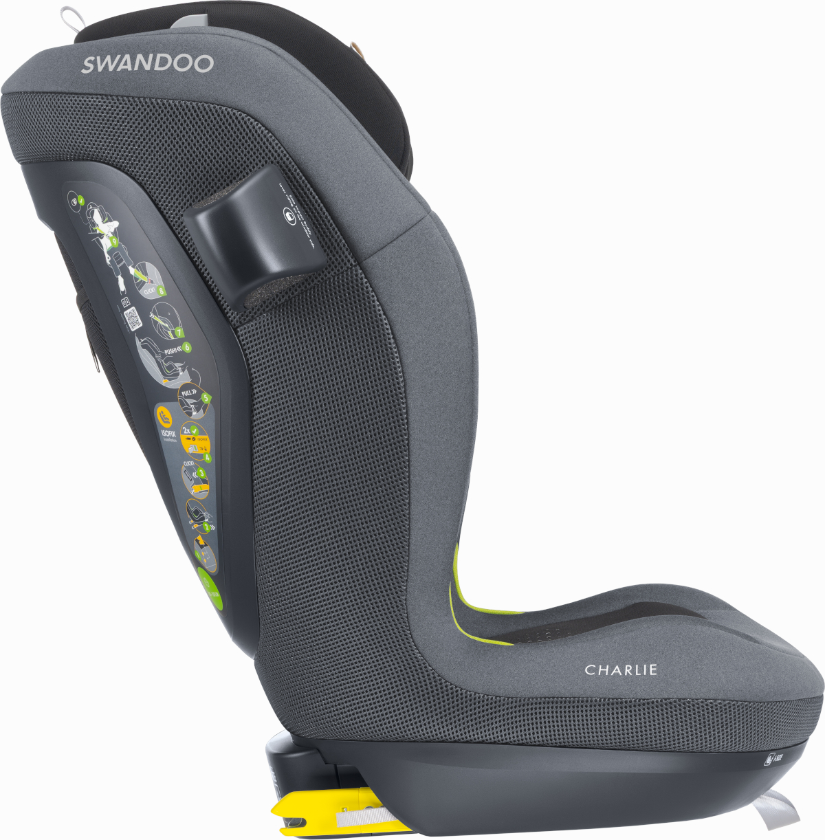Fotelik samochodowy Swandoo Charlie stworzono w oparciu o normę i-Size, a jego konstrukcja jest przystosowana do przewożenia starszych dzieci o wzroście od 100 do 150 cm. Jego zadaniem jest sprawienie, aby każda podróż dziecka zakończyła się bezpiecznym dotarciem do celu. Swandoo Charlie posiada modularną budowę, rośnie razem z dzieckiem poprzez 11-stopniową regulację zagłówka oraz automatycznej regulacji szerokości. Komfort dziecka podczas krótszych i dłuższych podróży zapewniają ergonomiczne podłokietniki oraz liczne otwory wentylacyjne, fotelik montuje się przodem do kierunku jazdy za pomocą pasa samochodowego lub dodatkowo systemu Isofix.