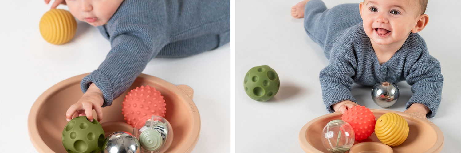 Na powierzchni tacki znajduje się 5 zróżnicowanych piłek sensorycznych: stalowe lusterko wspierające rozwój samoświadomości, przezroczysta kula do ćwiczeń wzroku oraz trzy miękkie piłki z piszczałkami i różnorodnymi fakturami, które pobudzają zmysł dotyku. Każdy element został zaprojektowany tak, aby stymulować dziecko do sięgania, chwytania, obserwacji i eksploracji otoczenia.