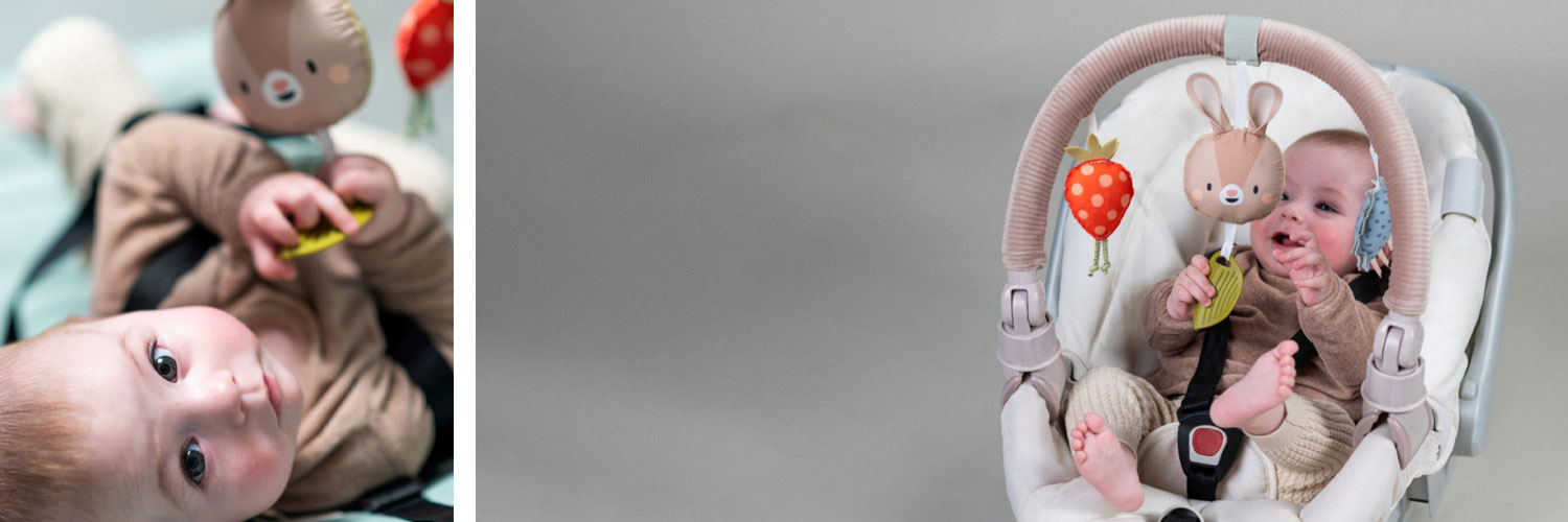 Trzy urocze, interaktywne zabawki - Muzyczny Króliczek, Grzechoczący Jeż i Truskawka z Dzwoneczkiem - zachęcają malucha do chwytania, potrząsania i odkrywania nowych faktur oraz dźwięków. Kojące melodie i delikatne odgłosy pomagają się wyciszyć, a regulowana wysokość pałąka gwarantuje wygodę w każdym wieku.