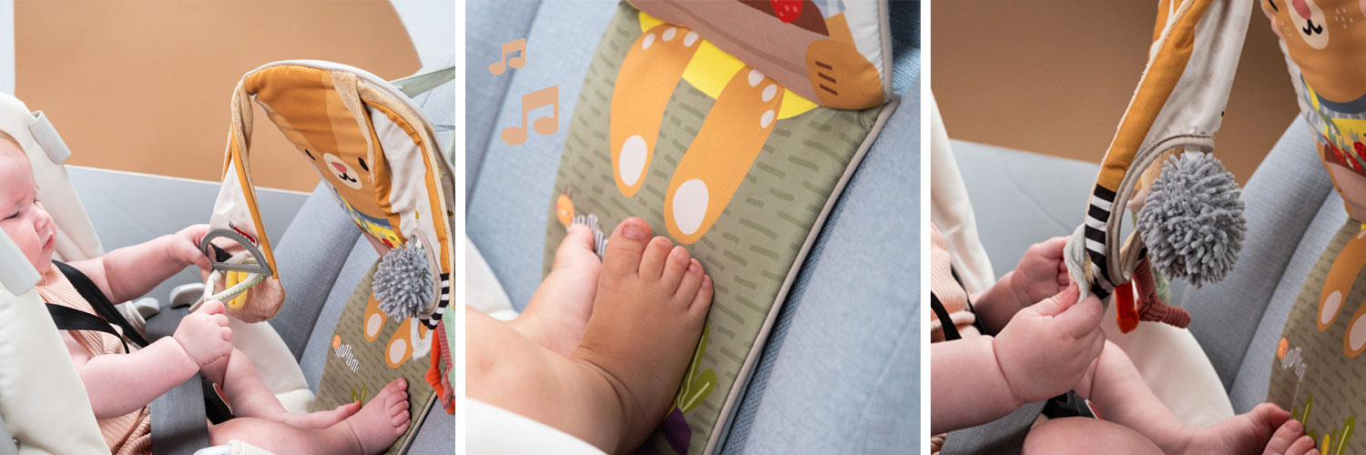 Taf Toys Królik to interaktywna zabawka zaprojektowana specjalnie dla niemowląt podróżujących tyłem do kierunku jazdy, która zamienia każdą podróż w radosną i rozwijającą przygodę. Dzięki wbudowanemu modułowi dźwiękowemu, melodie uruchamiają się po kopnięciu, zachęcając dziecko do ruchu oraz ucząc zależności przyczynowo-skutkowych. Zabawka została wzbogacona o różnorodne elementy sensoryczne - miękkie materiały, grzechoczące dodatki, bezpieczne lusterko, wstążki oraz fakturowane kulki - które stymulują zmysły i wspierają rozwój motoryczny malucha. Łatwe mocowanie do zagłówka fotelika samochodowego sprawia, że dziecko ma zawsze dostęp do angażującej, bezpiecznej zabawy w trakcie podróży.