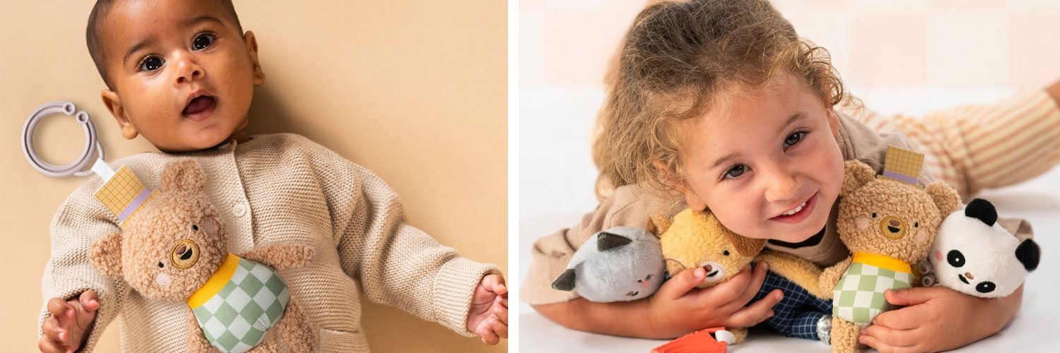 Miękkie materiały, kolorowe wstążki i szeleszczące elementy zachęcają dziecko do dotykania, ściskania i odkrywania. Gryzak pomaga łagodzić ból dziąseł podczas ząbkowania, stymulując jednocześnie zmysł dotyku. Dzięki praktycznemu zapięciu snap ring, misia można łatwo przypiąć do wózka, łóżeczka czy torby, aby zawsze był pod ręką - zarówno w domu, jak i w podróży.