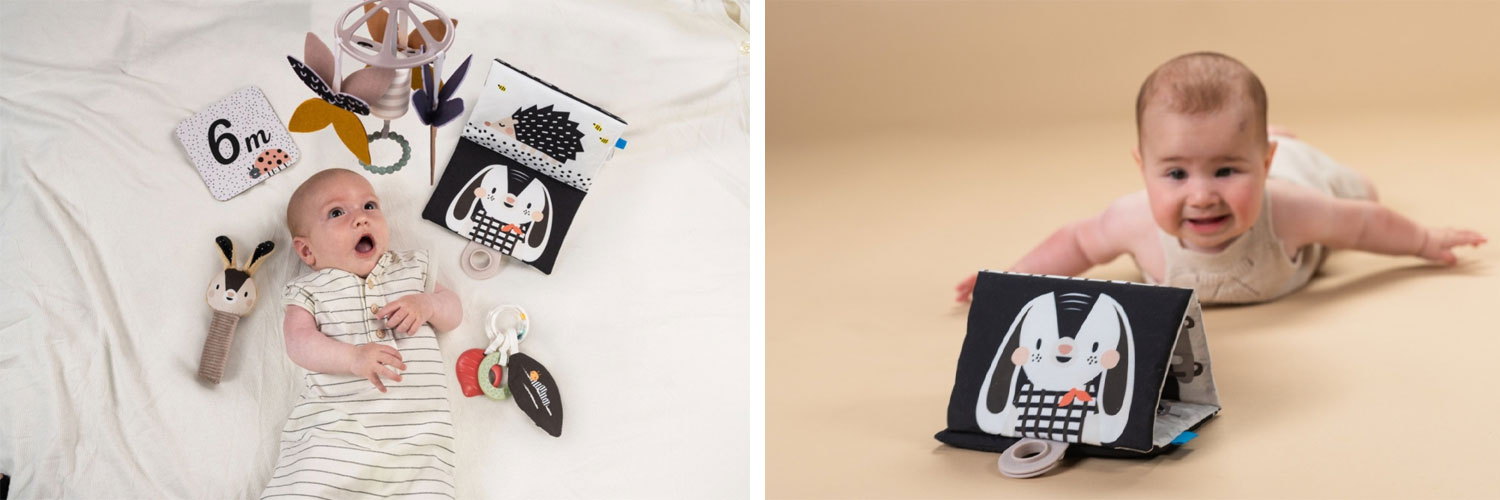 - Rozwój sensoryczny - czarno-biała książeczka, dzwoniąca zawieszka, grzechotka i szeleszczące elementy wspierają wzrok, słuch i dotyk;
