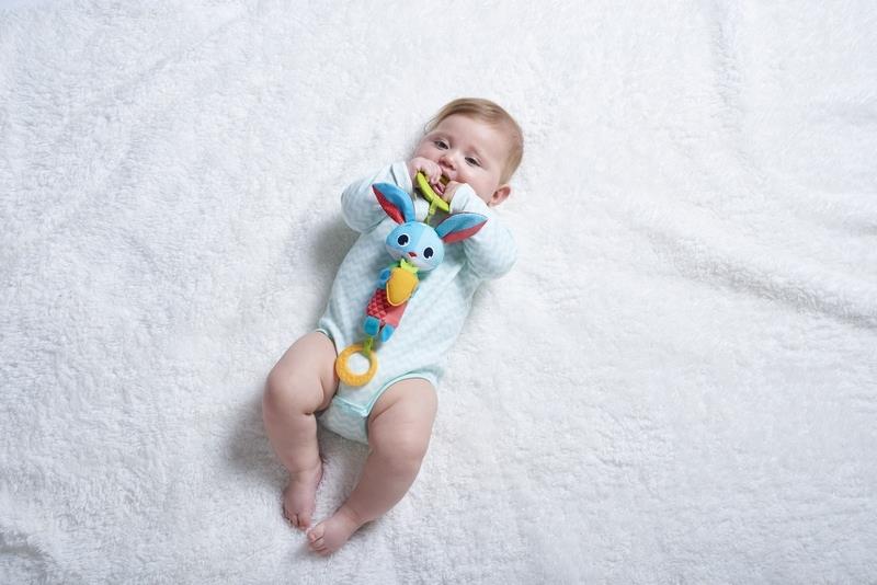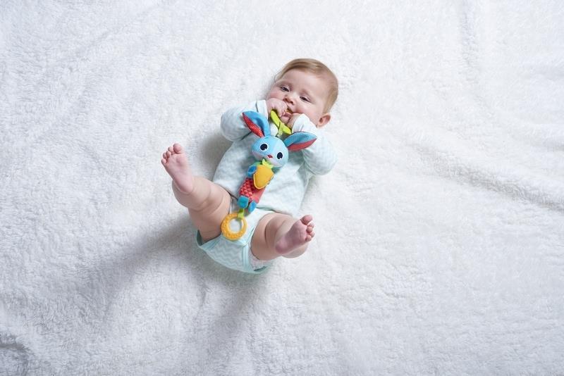 Dziecko zaczyna kontrolować ruchy ręką i łapać zwisające zabawki. Dotknięcie króliczka sprawia, że wydaje delikatny dźwięk dzwoneczka.