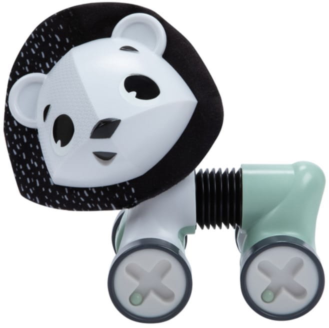 - Szeleszczące uszy, wirująca kula z koralikami oraz dźwięk kliknięcia, gdy głowa jest obracana, motywują dziecko do odkrywania i zabawy.