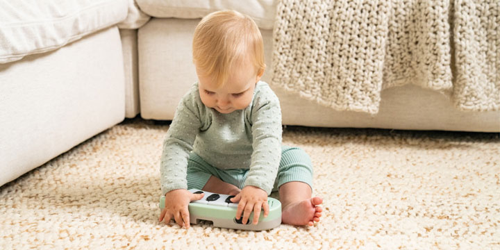 Małe elektroniczne pianino można zdjąć i ułożyć przed maluszkiem leżącym na brzuszku W ten sposób ćwiczy swoje mięśnie, jednocześnie poznając ekscytujacy świat dźwięków.