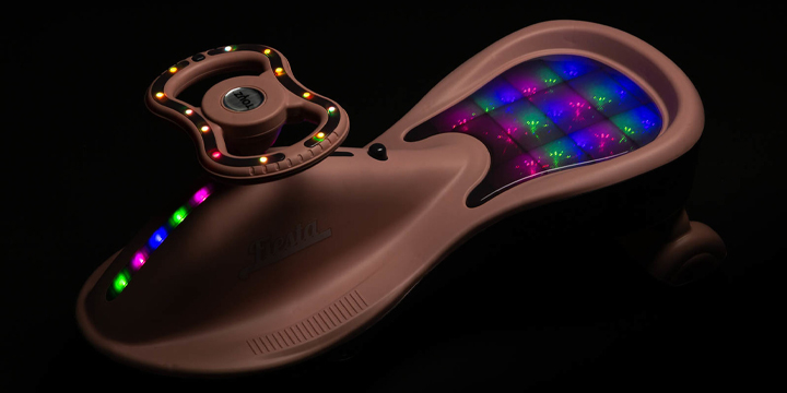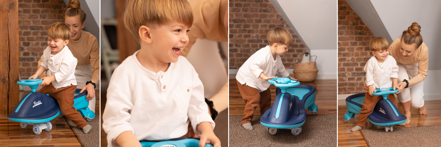 Wystarczy naprzemiennie poruszać kierownicą, aby wprawić w ruch jeździk grawitacyjny Toyz Fiesta. Jazda może odbywać się do przodu i do tyłu, a prowadzenie jeździka jest łatwe i wygodne.