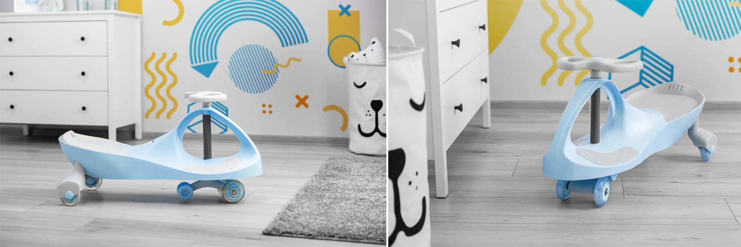 Do jazdy jeździkiem wymagany jest jedynie ruch kierownicą. Maluch może jechać do przodu lub do tyłu, w domu i na zewnątrz. Obsługa jeździka grawitacyjnego Toyz Spinner jest intuicyjna.