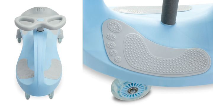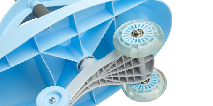 Spinner posiada kauczukowe koła, które chronią podłogę przed zarysowaniem. Przy odpowiedniej prędkości kółka jeździka się świecą, co dla dziecka będzie niemałą zabawą. Rozstaw kół zaprojektowano tak, aby zmniejszyć ryzyko wywrotki.