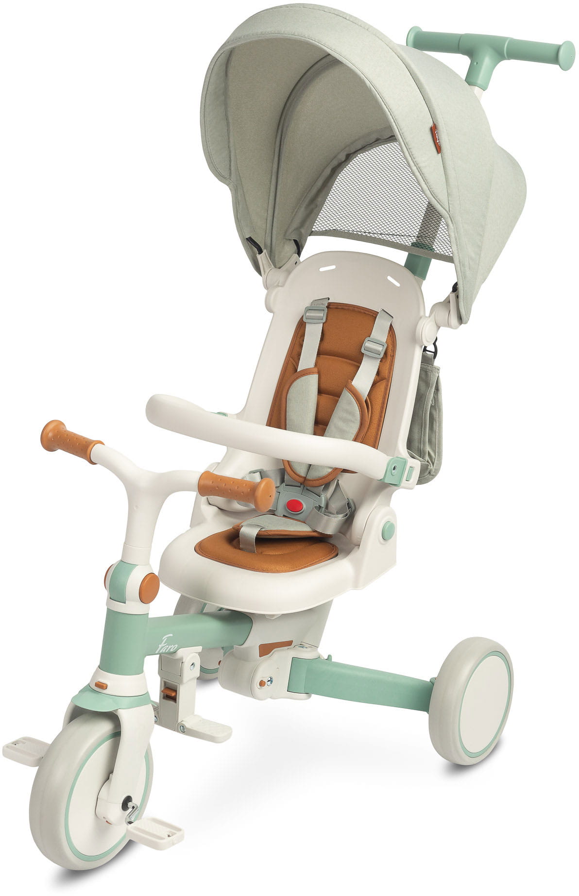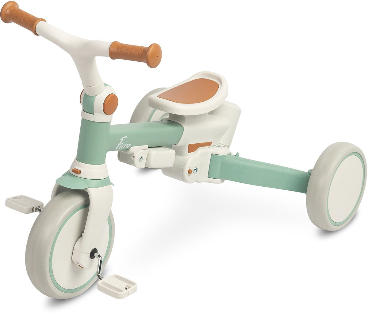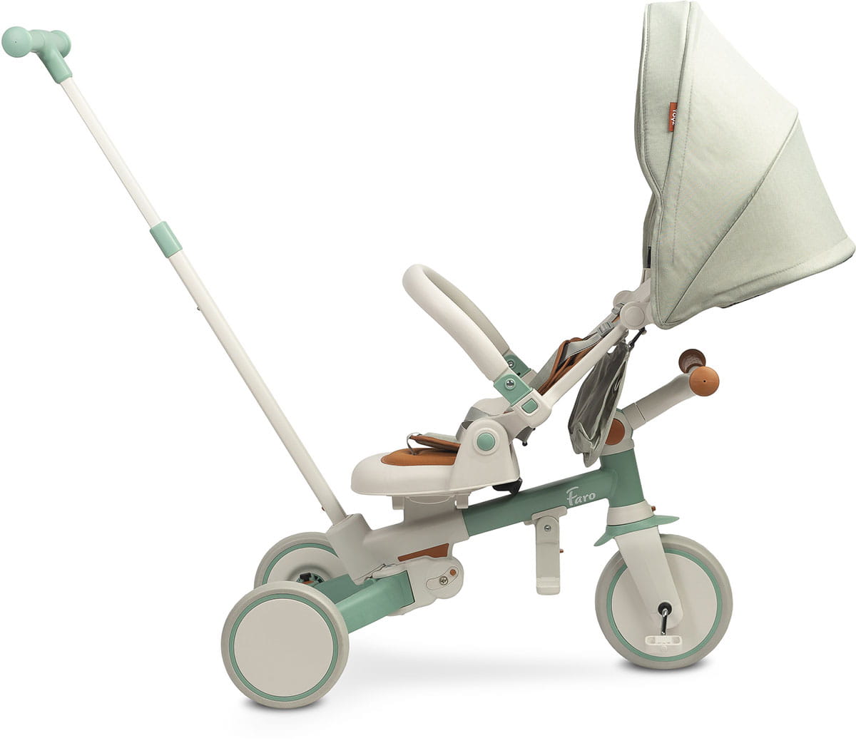 Praktyczna torebka na oparciu pomieści drobiazgi. Faro szybko przekształca się w rowerek trójkołowy lub biegowy, bez potrzeby użycia narzędzi. Składana rama umożliwia łatwe przewożenie w bagażniku małego samochodu.