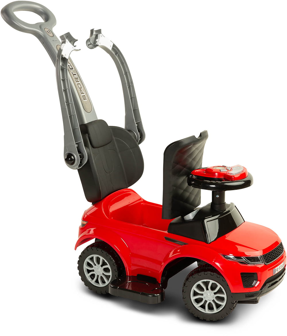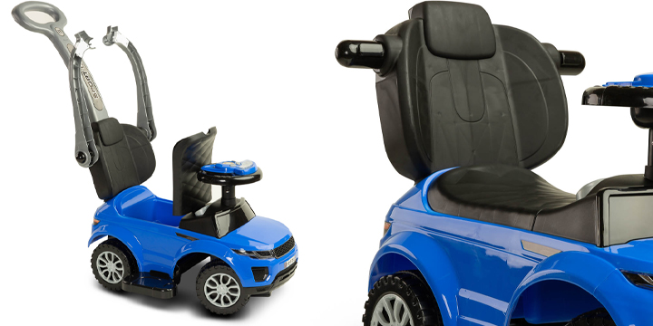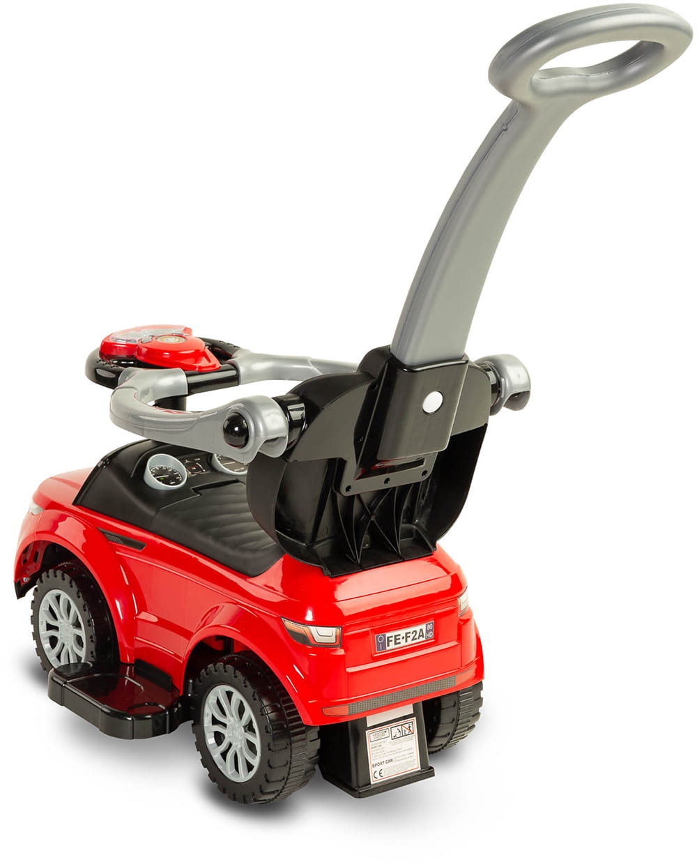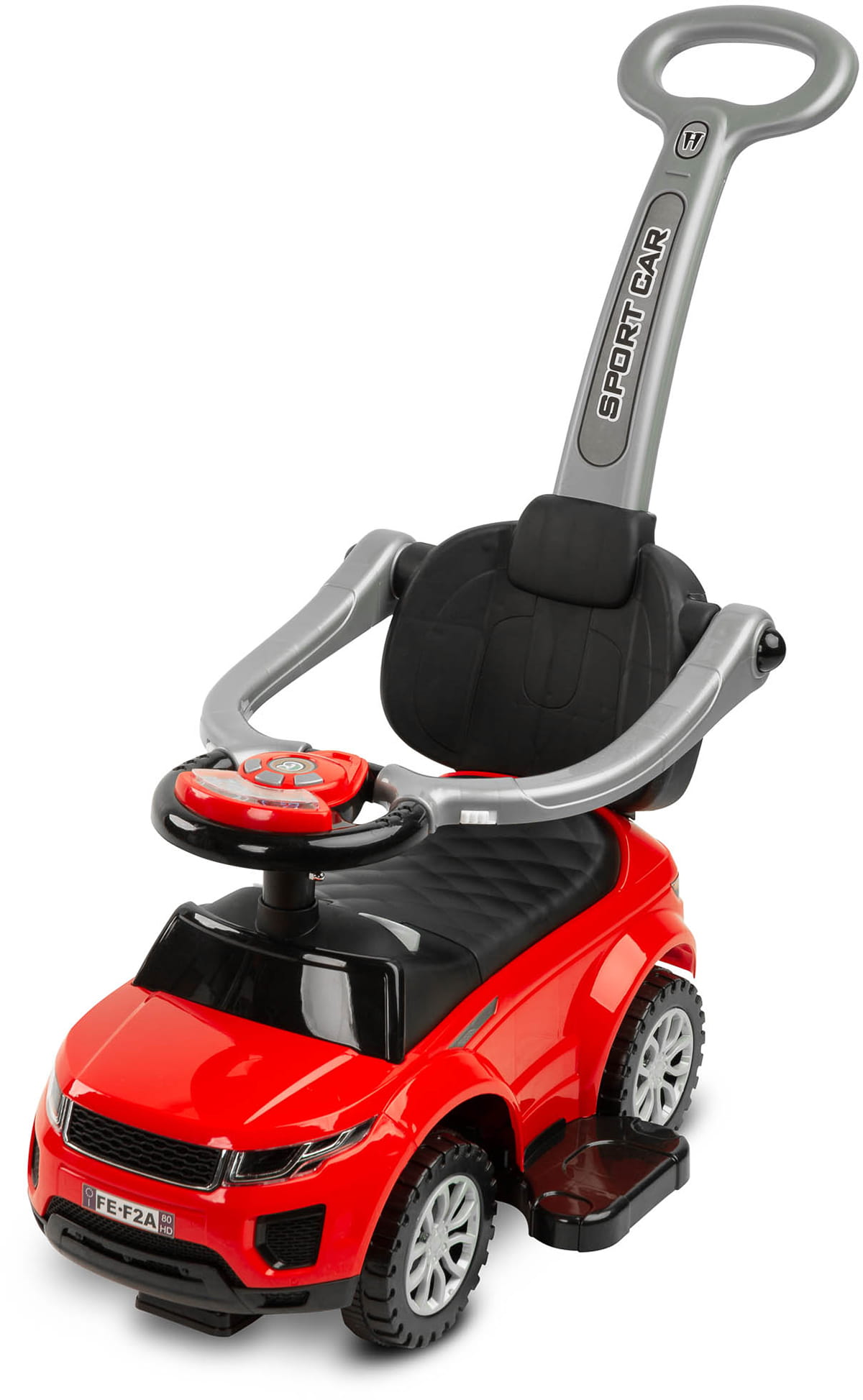 Jeździk może prowadzić rodzic - dzięki specjalnemu uchwytowi można zastąpić nim spacerówkę. Dodatkowo, posiada barierki, które zabezpieczą malucha przed wywrotką. Barierki są zdejmowane - po ich pozbyciu się, Sport Car staje się typowym jeździkiem dla starszego dziecka. Pod siedziskiem znajduje się specjalna skrytka.