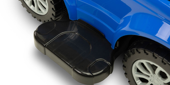 Jeździk posiada kierownicę ze światełkami i dźwiękami a także bardzo praktyczną skrytkę pod siedziskiem. Maluch jest chroniony przed wywróceniem się dzięki podnoszonym barierkom - nie tylko otaczając go niczym mur, ale jednocześnie uniemożliwiając skręt przednich kół.