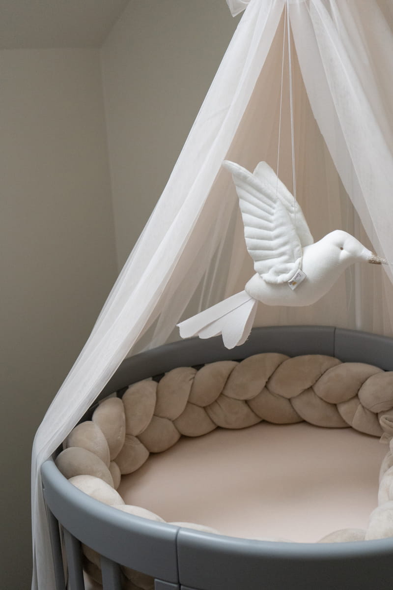 Ten luksusowy materiał nie tylko dodaje elegancji, ale również stanowi przyjemne dla dotyku wykończenie. Dzięki zastosowaniu weluru warkocz staje się nie tylko funkcjonalnym elementem łóżeczka, ale także estetycznym dodatkiem, który doskonale komponuje się z każdym wystrojem dziecięcego pokoju.