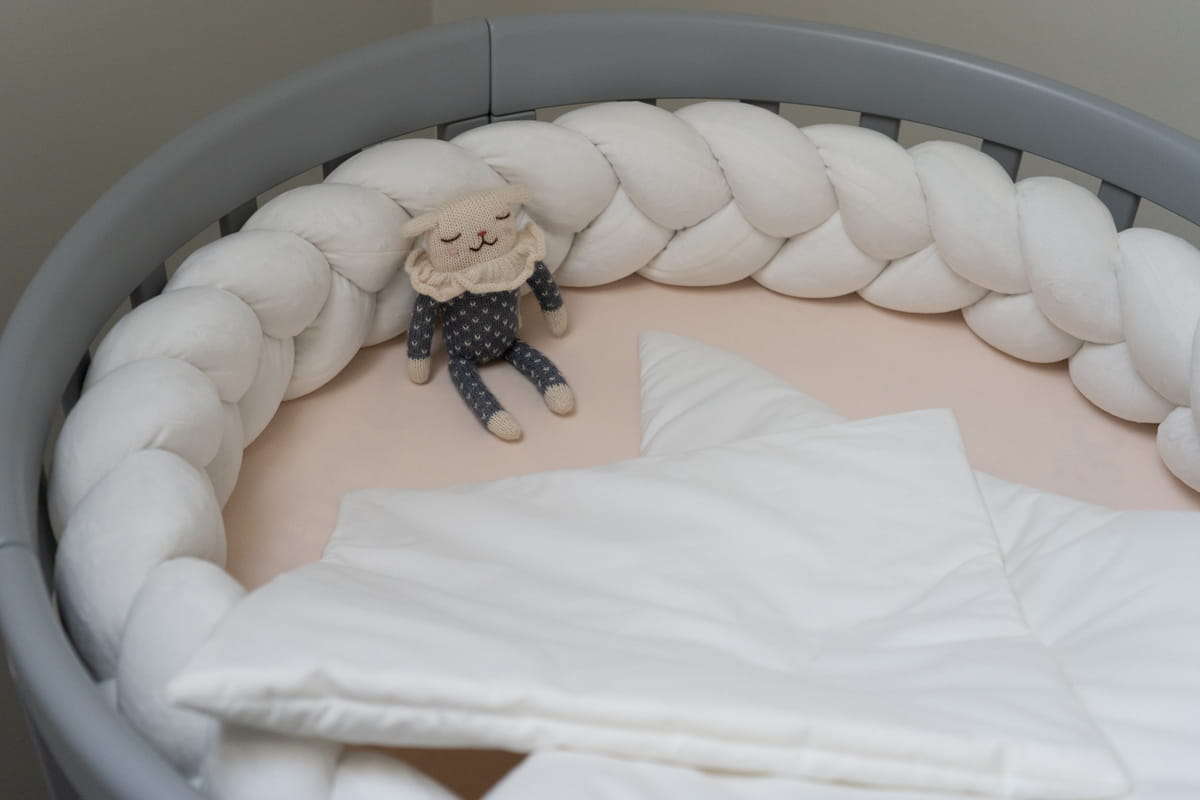 Prześcieradło skrojone pod duży materac owalnego łóżeczka Waldin 7w1 . Produkt projektowany, uszyty w Polsce, z polskich materiałów. Prześcieradło jest przyjemne w dotyku i miękkie.