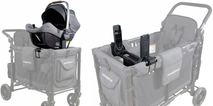 Wonderfold W2 Elite posiada opcję wpięcia na specjalnych, dedykowanych adapterach fotelika samochodowego. To doskonała opcja dla rodziców maluszków w różnym wieku. (Adaptery nie wchodzą w skład zestawu)