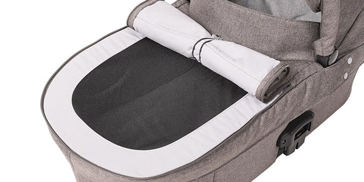 Osłonka na nóżki w X-Pram Light 2.0 posiada dodatkowy panel z moskitierą. Wystarczy odpiąć suwak z zewnętrzną warstwą materiału. To nie tylko sprytny sposób na ochronę przed owadami, ale też delikatny system cyrkulacji powietrza dla noworodka.
