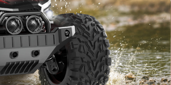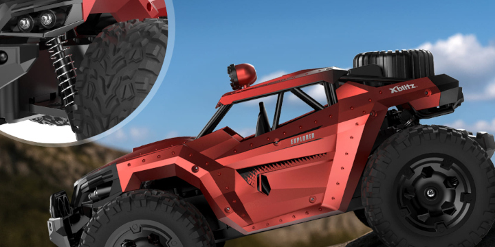 Xblitz EXPLORER ma masywne opony z głębokim wzorem bieżnika, które gwarantują świetną przyczepność na różnych powierzchniach. Auto pewnie sunie po piasku, trawie czy kostce brukowej - jest gotowe na zabawę w niemal każdych warunkach terenowych.