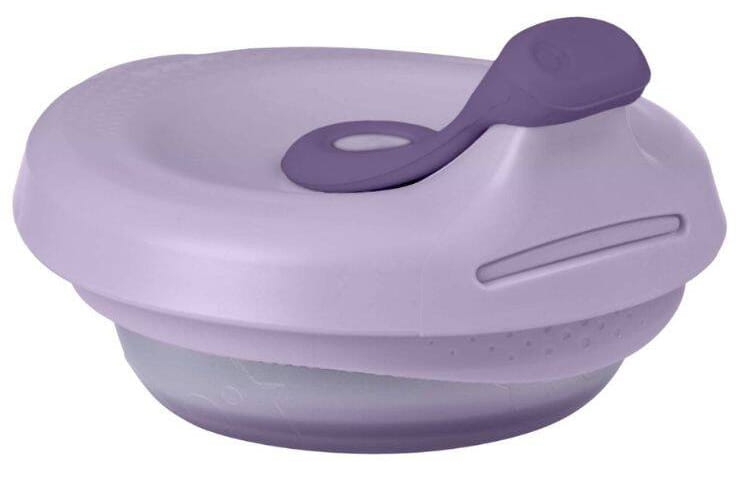 Materiały: PP (pokrywka) i silikon (miseczka) bez BPA Wiek dziecka: 4 mies.+ Pojemność miseczki: 110 ml Miseczkę można myć w zmywarce (górny kosz) i sterylizować w sterylizatorze (silikonowa miseczka do 200˚ C i pokrywka PP do 100˚ C). Zawsze należy sterylizować zgodnie z zaleceniami producenta. Można również używać w kuchence mikrofalowej, jednak należy upewnić się, że pokrywka jest otwarta podczas podgrzewania zawartości. Zaleca się podgrzewanie w odstępach 30 sekund i dokładne wymieszanie. Należy sprawdzić temperaturę żywności przed podaniem.